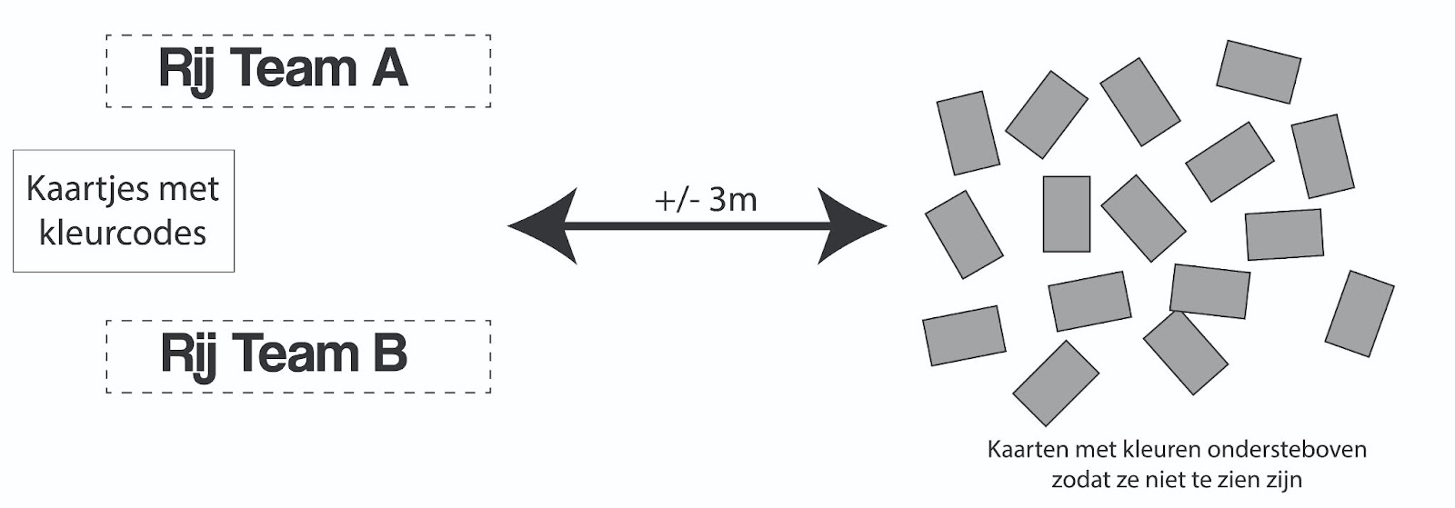 Op de grond liggen 18 kaarten met kleuren ondersteboven. Elk team pakt van de stapel één kaart met een kleurencode.