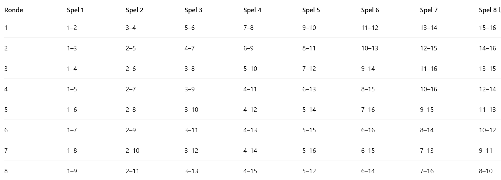 # Data voor het schemadata = { "Ronde": [1, 2, 3, 4, 5, 6, 7, 8], "Spel 1": ["1–2", "1–3", "1–4", "1–5", "1–6", "1–7", "1–8", "1–9"], "Spel 2": ["3–4", "2–5", "2–6", "2–7", "2–8", "2–9", "2–10", "2–11"], "Spel 3": ["5–6", "4–7", "3–8", "3–9", "3–10", "3–11", "3–12", "3–13"], "Spel 4": ["7–8", "6–9", "5–10", "4–11", "4–12", "4–13", "4–14", "4–15"], "Spel 5": ["9–10", "8–11", "7–12", "6–13", "5–14", "5–15", "5–16", "5–12"], "Spel 6": ["11–12", "10–13", "9–14", "8–15", "7–16", "6–16", "6–15", "6–14"], "Spel 7": ["13–14", "12–15", "11–16", "10–16", "9–15", "8–14", "7–13", "7–16"], "Spel 8": ["15–16", "14–16", "13–15", "12–14", "11–13", "10–12", "9–11", "8–10"]}